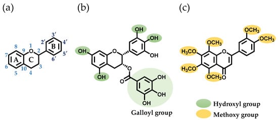 Structures of the polyphenols used in this study. (a) The basic skeleton and numbering system of a flavonoid. (b) The structure of (–)-epigallocatechin gallate (EGCG). (c) The structure of nobiletin (NOL).