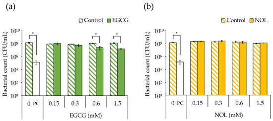 Impact of polyphenols on Staphylococcus aureus growth. (a) EGCG; (b) NOL. The concentrations used were as follows: 0.15, 0.3, 0.6, and 1.5 mM for EGCG, and 0.1, 0.3, 1.5, and 3.0 mM for NOL. The corresponding concentrations of dimethyl sulfoxide (control), in which each polyphenol was dissolved, were 0.5%, 1.0%, 2.0%, and 5.0% for EGCG, and 0.3%, 1.0%, 5.0%, and 10% for NOL. The untreated solution was used as a negative control (0 mM), and the solution with a final concentration of 100 μg/mL kanamycin was used as a positive control (PC). The relative bacterial count was determined based on the number of colonies on mannitol salt agar. The data are presented as the mean ± SD of three or more independent experiments. * indicates statistical significance (p < 0.05) compared to the control.