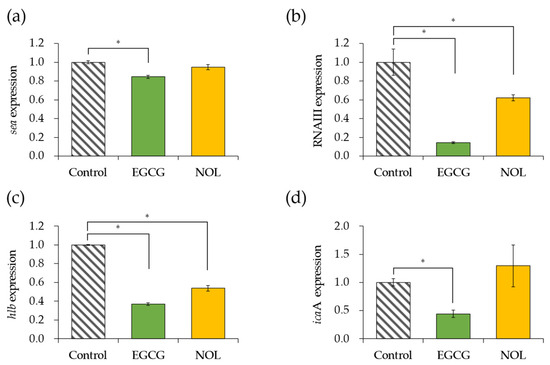 The impact of EGCG and NOL on the expression of four virulence factor genes in S. aureus was investigated. A concentration of 0.3 mM for each polyphenol was employed, ensuring that bacterial growth was not inhibited. Each gene was assessed at the specific incubation time (5 h for the sea and 4 h for the other genes) that it exhibited the highest expression in the control. As depicted in Figure 3a, EGCG led to a 1.2-fold decrease in sea (SEA gene) expression, while NOL did not induce any change. EGCG and NOL resulted in 7.0-fold and 1.6-fold decreases in the expression of RNAIII (the quorum sensing effector gene) (Figure 3b), and 2.7-fold and 1.9-fold decreases in the expression of hlb (the beta-hemolysin gene) (Figure 3c). Additionally, EGCG caused a 2.3-fold decrease in the expression of icaA (biofilm formation-related gene), whereas NOL did not affect it (Figure 3d).