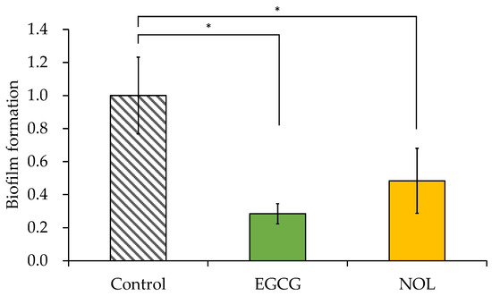 The impacts of EGCG and NOL on biofilm formation in S. aureus were investigated using a concentration of 0.3 mM for each polyphenol that did not impede bacterial growth. As illustrated in Figure 4, EGCG and NOL exhibited a 3.5-fold reduction and a 2.1-fold reduction, with significant inhibitory effects on biofilm formation.