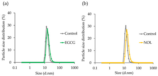The particle size of MVs prepared with EGCG and NOL was determined using DLS. The mean diameter of each MV was 14.8 nm for the control without EGCG, 17.2 nm for EGCG treatment (Figure 5a), 14.0 nm for the control without NOL, and 17.5 nm for NOL treatment (Figure 5b). Both polyphenols had no discernible effect on the particle size distribution of S. aureus-derived MVs.