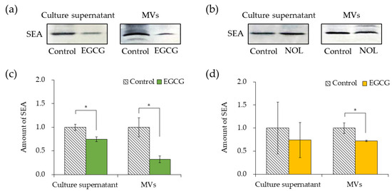 Comparison of the amount of SEA in the culture supernatant and membrane vesicles (MVs) derived from Staphylococcus aureus with polyphenols. (a) SEA production in the culture supernatant of S. aureus incubated with EGCG, and SEA content in S. aureus-derived MVs with EGCG (analyzed via SDS-PAGE and visualized through Western blotting). (b) SEA production in the culture supernatant of S. aureus incubated with NOL, and SEA content in S. aureus-derived MVs with NOL (analyzed via SDS-PAGE and visualized through Western blotting). (c) Quantification of SEA in the culture supernatant of S. aureus incubated with EGCG, and in MVs with EGCG. (d) Quantification of SEA in the culture supernatant of S. aureus incubated with NOL, and in MVs with NOL. Each MV sample underwent Western blot analysis using SEA antibodies; the same concentration of dimethyl sulfoxide (DMSO) in which each polyphenol was dissolved served as a control for the culture supernatant, and 1% dimethyl sulfoxide served as a control for polyphenol samples. Adobe Photoshop was employed for contrast and brightness adjustments to enhance visibility without altering the relative positions of polyphenol samples and controls. Data represent mean ± SD from three or more independent experiments. * denotes p < 0.05 compared to the control.