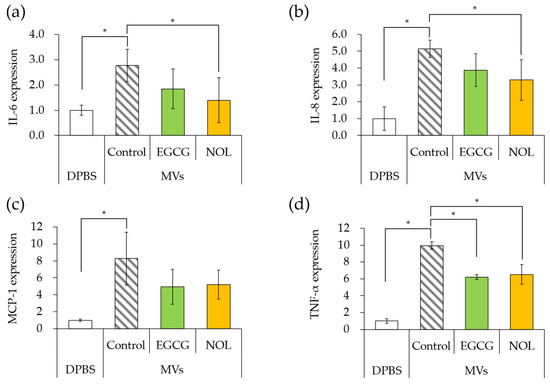 Expression levels of inflammation-related genes induced by membrane vesicles (MVs) prepared with polyphenols. (a) interleukin-6 (IL-6); (b) interleukin-8 (IL-8); (c) monocyte chemoattractant protein-1 (MCP-1); (d) tumor necrosis factor (TNF-α). MVs prepared with EGCG or NOL were introduced to human adult low-calcium high-temperature (HaCaT) cells to assess the expression of inflammation-related genes. Dulbecco’s phosphate buffer (DPBS) served as a control instead of MVs. Control MVs comprised 1% dimethyl sulfoxide without 0.3 mM polyphenols. Asterisks represent significant differences (Tukey–Kramer test, p < 0.05). Values represent the mean ± SD from three independent experiments.