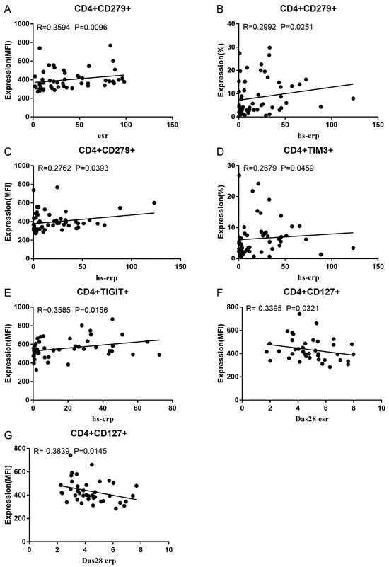 Significant correlation between RA disease activity and Co-IR expression on CD4 T cells. (A) CD4/CD279 MFI with hsCRP (p = 0.0393, N = 56); (B) CD4/CD279 MFI with ESR (p = 0.0096, N = 51); (C) CD4/CD279% with hsCRP (p = 0.0251, N = 56); (D) CD4/TIM3% with hsCRP (p = 0.0459, N = 56); (E) CD4/TIGIT MFI with hsCRP (p = 0.0156, N = 45); (F) CD4/CD127 MFI with DAS28-ESR (p = 0.0321, N = 40); (G) CD4/CD127 MFI with DAS28-CRP (p = 0.0145, N = 40).