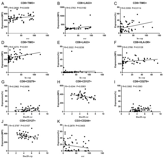 Significant correlation between RA disease activity and Co-IR expression on CD3 and CD8 T cells. (A) CD8/TIM3 MFI with ESR (p = 0.0459, N = 51); (B) CD8/LAG3 MFI with ESR (p = 0.0182, N = 39); (C) CD8/TIM3% with hsCRP (p = 0.0114, N = 56); (D) CD8/TIM3 MFI with hsCRP (p = 0.001, N = 56); (E) CD8/LAG3% with hsCRP (p = 0.0236, N = 56); (F) CD8+HLA-DR MFI with hsCRP (p = 0.0128, N = 43); (G) CD8/CD279% with DAS28-ESR (p = 0.0456, N = 46) (H); CD8/CD127 MFI with DAS28-ESR (p = 0.0063, N = 40); (I) (CD8/CD279% with DAS28-CRP (p = 0.0363, N = 47); (J) CD8/CD127 MFI with DAS28-CRP (p = 0.0157, N = 40); (K) CD3/CD244% with ESR (p = 0.0405, N = 51).