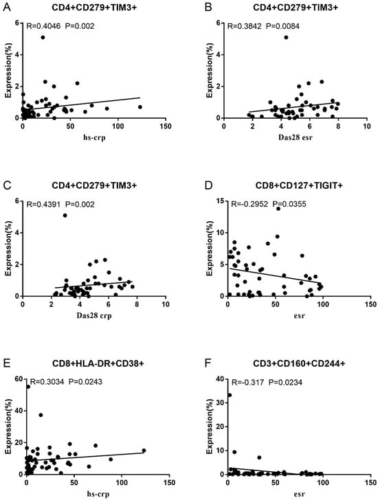 Significant correlation between RA disease activity and expression of two Co-IRs on T cells. (A) CD4+CD279+TIM3+% with hsCRP (p = 0.002, N = 56); (B) CD4+CD279+TIM3+% with DAS28-ESR (p = 0.0084, N = 46); (C) CD4+CD279+TIM3+% with DAS-28 CRP (p = 0.002, N = 47); (D) CD8+CD127+TIGIT+% with ESR (p = 0.0355, N = 51); (E) CD8+HLA-DR+CD38+% with hsCRP (p = 0.0243, N = 55); (F) CD3+CD160+CD244+% with ESR (p = 0.0234, N = 51).
