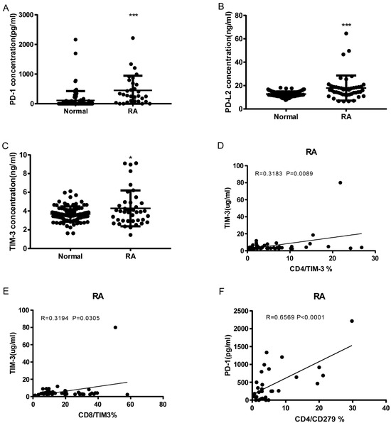 Soluble PD-1, PDL-2, and Tim3 levels elevated RA and correlation with T cell Co-IR expression. (A) sPD1: 450.5 ± 89.01, n = 31 vs. 111.1 ± 32.92, n = 92 p < 0.0001; (B) sPDL2: 17.9 ± 1.566, n = 47 vs. 12.78 ± 0.2314, n = 92 p < 0.0001; (C) sTIM3: 4.288 ± 0.3015, n = 40 vs. 3.675 ± 0.08441, n = 92 p = 0.0104); (D) sTIM3 levels were correlated with CD4+TIM3+% (p = 0.0089, N = 46); (E) CD8+TIM3+% (p = 0.0305, N = 46); (F) sPD1 levels were correlated with CD4+CD279+ % (p < 0.0001, N = 31). ***, p < 0.001; *, p < 0.05.