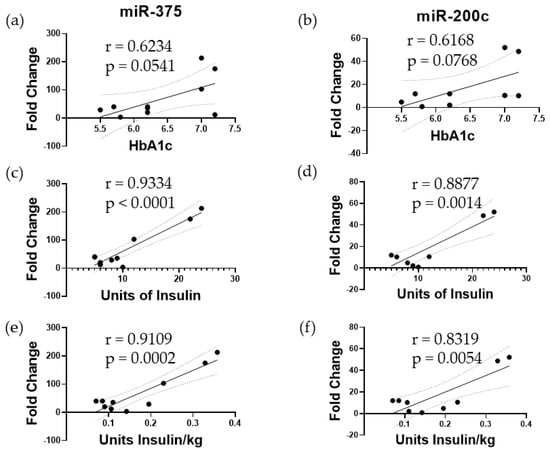 Correlation analysis of miRNA expression 1 h post-infusion with 3-month transplant outcomes. The fold change in (a) miR-375 and (b) miR-200c showed a positive trend when compared to 3-month hemoglobin A1c values. (c) miR-375 and (d) miR-200c fold change also showed a significant positive trend when compared to insulin use at 3 months post-TPIAT. This same trend was observed when (e) miR-375 and (f) miR-200c were compared to the insulin dose 3 months after TPIAT.