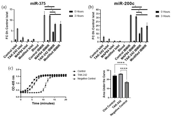 Inhibition of islet damage by TAK-242 in vitro as measured by the expression of (a) miR-375 and (b) miR-200c during an in vitro IBMIR reaction. Aliquots of islets and blood were mixed in vitro in the presence of TAK-242 or structural analog, MAP84, and the supernatant was analyzed for miR-375 and miR-200c using RT-PCR; (c) clotting assay results for islets exposed to platelet-poor plasma. * p < 0.05, **** p < 0.0001.