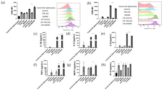 (a) CD83 and (b) CD80 expression was measured on dendritic cells 24 h after PBMCs were mixed with allogenic splenocytes. Cytokines (c) IL-1β, (d) IL-6, (e) IL-8, (f) TNFα, (g) MCP1, and (h) IP-10 were quantified in the supernatant of this one-way mixed lymphocyte reaction. (* p < 0.05, ** p < 0.005, *** p < 0.0005, **** p < 0.0001).