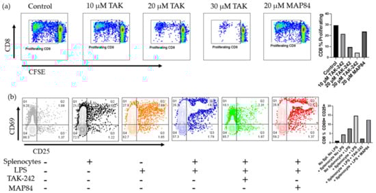 We next investigated whether administration of TAK-242 resulted in decreased priming and activation of T cells in the mixed lymphocyte reaction. The initial results showed that TAK-242 decreased the proliferation of CD8+ T cells in a dose-dependent manner (Figure 4). Our observations indicated that combining allogenic splenocytes with LPS as an adjuvant resulted in a synergistic effect leading to an increased number of CD8+ CD69+ CD25+ T cells. As CD8+ T cells are known to express TLR4 and react to markers of sterile inflammation such as IL-12, we next investigated whether TAK-242 directly inhibits CD8+ T cell activation []. Upon stimulation with CD3/CD28 antibody-coated beads, we noted a dose-dependent decrease in CD8+ T cell activation, as well as proliferation in the presence of TAK-242 that was not affected by inactive analog, MAP84 (Figure 5). We also confirmed the presence of TLR4 on these cells and noted increased TLR4 expression as these cells became activated (Figure 5).