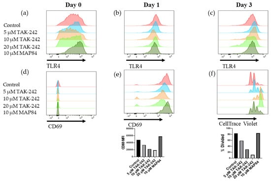 TLR4 expression on CD8+ T cells undergoing polyclonal CD3/CD28 stimulation (a) at the beginning of the experimental period, (b) after 24 h, and (c) after 3 days. CD69 expression was monitored on CD8+ T cells (d) at the beginning of the experiment and (e) 1 day after beginning the experiment. (f) Proliferation was monitored 3 days after stimulating CD8+ T cells with CD3/CD28-coated beads.