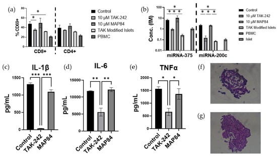 The mixed lymphocyte reaction was repeated utilizing islets instead of splenocytes. Soluble TAK-242 as well as islets modified with NHS-Linker-TAK-242 showed significantly fewer CD69+ CD8+ T cells (control = 47.8 ± 3.2%, TAK-242 = 35.35 ± 1.35%, MAP84 = 49.35 ± 7.15%, TAK-242 modified = 32 ± 0.2, p < 0.05) after 24 h of co-culture (Figure 6). This decreased activation was accompanied by decreased stress and damage to miRNA-375 (control = 6.60 ± 1.13 fM, TAK-242 = 0.927 ± 0.170 fM, MAP84 = 10.413 ± 4.881 fM, TAK-242 modified = 0.258 ± 0.0570 fM, p < 0.05) and miRNA-200c (control = 2.266 ± 0.307f, TAK-242 = 0.148 ± 0.0634 fM, MAP84 = 2.111 ± 0.232 fM, p < 0.05) (Figure 6). There was also a significant decrease in IL-1β (control = 1310 ± 32 pg/mL, TAK-242 = 37 ± 2.9 pg/mL, MAP84 = 1090 ± 45.5 pg/mL, p < 0.05), IL-6 (control = 11,792 ± 81 pg/mL, TAK-242 = 5592 ± 825 pg/mL, MAP84 = 12,216 ± 419 pg/mL, p < 0.05), and TNFα (control = 1558 ± 254 pg/mL, TAK-242 = 649 ± 172 pg/mL, MAP84 = 1298 ± 211 pg/mL, p < 0.05) present in the supernatant of the TAK-242-treated samples (Figure 6). Islets extracted from control and TAK-242-treated co-cultures showed improved islet structure in the cultures containing TAK-242.