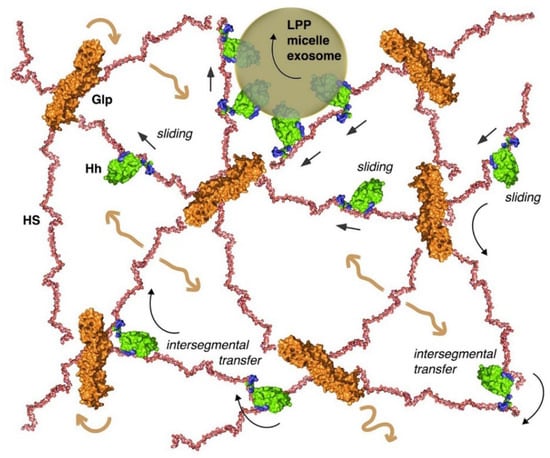 The model of direct morphogen transfer from one Glp–HS chain to the next may apply to Hh associated with Shf, to delipidated Hh released as a consequence of double processing of the two terminal lipidated Hh peptides, or to Hh attached to LPPs or other lipid carriers (Figure 5). One mechanism by which all these forms of Hh could be distributed on developing epithelial surfaces is through electrostatic interactions between the negatively charged Glp–HS sugar–sulfate chains and two basic HS-binding sites on the Hh morphogen [118,119]. These direct electrostatic interactions guide and constrict extracellular Hh transport to the HS-rich epithelial surface to maximise the efficiency with which Hh searches for its receptor, a process termed “sliding” (Figure 5). In addition to the possibility of both Hh binding sites interacting with the same extracellular HS chain, each binding site may also interact directly with different neighbouring chains to switch directly between them and move in the gradient field, a process termed “intersegmental transfer (IST)” (Figure 5). This extracellular transport mode is strikingly similar to the mode used by DNA polymerases, transcription factors, nucleases, and other DNA-binding proteins in the nucleus [120]. Similar to HS-binding proteins that interact with the sugar–sulphate HS chain, DNA-binding proteins associate with the negatively charged sugar–phosphate DNA backbone through non-specific, long-lived electrostatic interactions [121,122]. These electrostatic attractions prevent the protein from diffusing away from DNA but allow it to move by sliding along the axis of the double helix to find its targets more quickly. During this process, one binding site occasionally remains associated with one strand of DNA while the other binding site engages in target search as a prerequisite for inter-DNA transfer or intersegmental transfer [123]. Importantly, the intersegmental transfer is characterised by direct protein transfer between negatively charged sugar backbones. Protein movement by intersegmental transfer can be illustrated by children playing “monkey bars”, moving from one bar to the next, always holding one bar—and occasionally both bars—to prevent falling. Intersegmental protein transfer therefore differs from previously proposed mechanisms postulated for proteins with a single binding site. Such proteins move by repeated cycles of sugar–polymer binding, unbinding, passive diffusion, and sugar–polymer rebinding of the protein, called “hindered” or “restricted” diffusion.