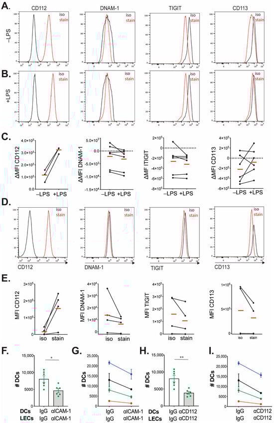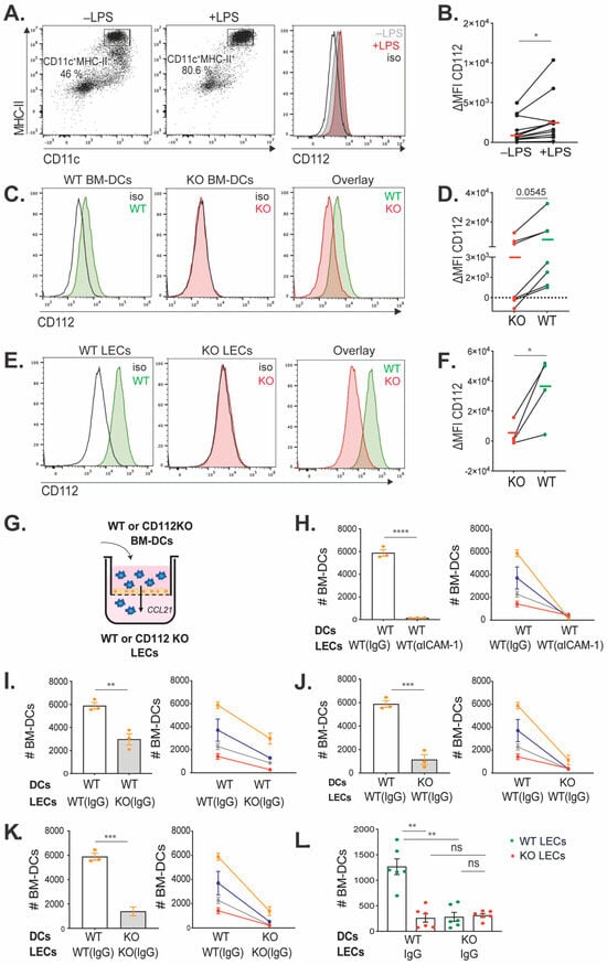 Isolated mouse LN-LECs were seeded on precoated 96-well plates (Corning Costar®, Corning, NY, USA) with collagen/fibronectin (10 µg/mL). LN-LECs were treated with blocking antibodies or corresponding isotype controls for 1 h at 37 °C. Then, 10,000 WT or CD112 KO BM-DCs were added on top of treated LECs and incubated for 45 min at 37 °C. After incubation, non-adherent BM-DCs were removed and mouse LECs were washed twice with PBS. LECs were detached with Accutase, and the cell suspensions were stained with Armenian hamster anti-mouse CD11c-APC and rat anti-mouse MHCII-BV421. The number of BM-DCs was quantified by flow cytometry using a CytoFlex S Flow Cytometer (Beckman Coulter).