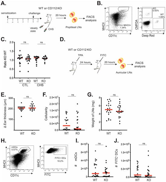 29]. For that purpose, LPS-matured WT and CD112 KO BM-DCs were labeled with CMFDA or DeepRed (DR) dyes. After labeling and washing with PBS, 0.5 million labeled WT BM-DCs were mixed with 0.5 million labeled CD112 KO BM-DCs (ratio 1:1) and injected in the total volume of 10 µL into the CHS-inflamed or steady-state footpad of WT and CD112 KO mice (total of 1 million cells in 10 µL sterile PBS per each footpad). After 20 h of adoptive transfer of BM-DCs to the footpad of mice, the popliteal LNs were harvested and passed through 40 μm cell strainers. The single-cell suspensions were stained with BV421 rat anti-mouse MHC-II and PE/Cy7 Armenian hamster anti-mouse CD11c for 30 min at 4 °C. The samples were acquired on a CytoFlex S, and the total number of migratory labeled (CMFDA or DR) BM-DCs were analyzed using FlowJo software version 10.9.0.