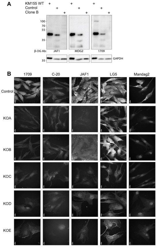 Numerous antibodies are available for dystroglycan; however, many have not been KO tested. The availability of human DAG1 KO myoblasts permitted the screening of available antibodies by Western blotting and immunofluorescence to establish those which are fit for purpose. MANDAG2, 1709, and JAF1 detected full-length βDG at 43 kDa and a number of fragmentation products in WT and CRISPR control cells. These bands were not detected in DAG1 KO cells (Figure 1A). Using immunofluorescence, it was found that C20 and LG5 staining was not reduced in DAG1 KO clones, indicating non-specific staining (Figure 1B). It should also be noted that other DAG1 antibodies, MANDAG2, 1709, JAF1, displayed a level of background staining which should be accounted for during analysis.