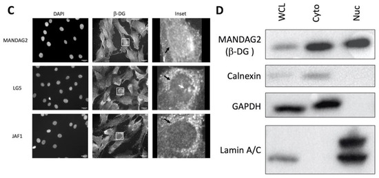 16. Mathew, G.; Mitchell, A.; Down, J.M.; Jacobs, L.A.; Hamdy, F.C.; Eaton, C.; Rosario, D.J.; Cross, S.S.; Winder, S.J. Nuclear targeting of dystroglycan promotes the expression of androgen regulated transcription factors in prostate cancer. Sci. Rep. 2013, 3, 2792. [Google Scholar] [CrossRef]