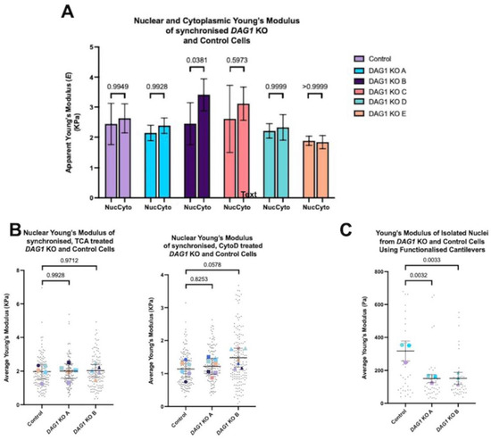 Figure 4. Nuclear atomic force microscopy in myoblasts deficient in DAG1. (A) Nuclear and cytoplasmic Young’s Modulus of G1 synchronised WT and DAG1 KO KM155 cells. Cells were measured using commercial cantilevers. A total of 6 independent experiments were carried out with 90 individual cells measured per sample. Graph shows mean and standard deviation; p values for multiple comparisons using Šídák’s multiple comparisons test are in the graph. (B) Nuclear Young’s Modulus of WT and DAG1 KO KM155 cells following treatment with 300 nM TCA or 500 nM Cytochalasin D. Nuclei were measured using a functionalised cantilever. Small black points indicate values from individual cells while larger coloured points indicate the average for each independent experiment. A total of 5 independent experiments were carried out with 100 individual nuclei measured per sample. Graph shows mean and standard deviation. A significant difference was not found between any of the samples as determined by the one-way ANOVA test p = 0.9764. The p values for multiple comparisons using Dunnett’s multiple comparisons test are in the graph. (C) Young’s Modulus of the isolated nuclei from WT and DAG1 KO KM155 cells. Mechanical properties of isolated nuclei from control and DAG1 KO A and B as measured by a functionalised MLCT cantilever. Small black points indicate individual nuclei while larger coloured points indicate the average of each experiment. Two individual outlier points from the control column were excluded to enable better visualisation; these values were 1121 Pa and 2553 Pa. n = 3 independent experiments with 35 individual cells measured per sample (except control where n = 36). Statistical analysis using one-way ANOVA test p = 0.0047. p values for multiple comparisons using Dunnett’s multiple comparisons test are in the graph.