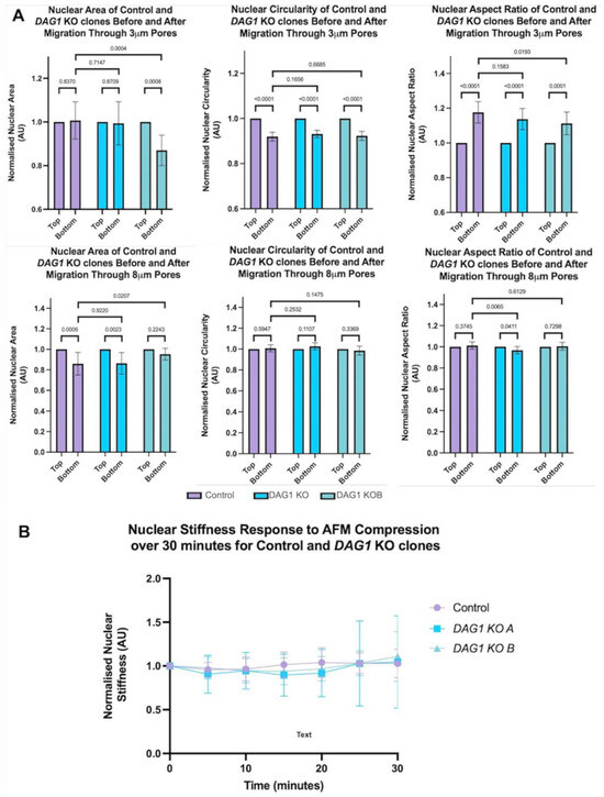 Figure 5. Myoblasts lacking DAG1 do not display hypersensitivity to mechanical strain. (A) Nuclear size and shape quantification after migration through 8 μm or 3 μm transwell pores. Nuclear morphology was measured in cells which had and had not migrated through the transwell pores. Nuclear morphology parameters are displayed on graphs. At least 150 cells were measured for each condition. One-way ANOVA with Šídák’s multiple comparisons test. (B) Nuclear response over time to repeated presssure by AFM in WT and DAG1 KO nuclei. A total of 1 kPa was applied to the nuclei and nuclear stiffness was measured every 5 min for a total of 30 min.