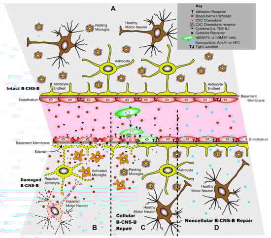 Together, proposed noncellular treatments may enhance endogenous EC repair through the entry of various biomolecules into the damaged endothelium, leading to B-CNS-B restoration and motor neuron survival in ALS as schematically illustrated in Figure 1D.