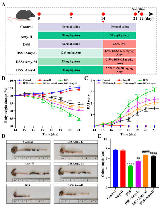 Effect of Amy administration on the symptoms of DSS-induced colitis in mice. (A) Experimental procedure diagram. (B,C) Body weight changes and DAI scores (n = 6). Colors represent different groups. (D) Representative photographs of the colon (n = 6). (E) Changes in colon length (n = 6). Data are expressed as mean ± SEM. Compared to the control group, **** p < 0.0001. Compared to the DSS group, ## p < 0.01, ### p < 0.001, and #### p < 0.0001.