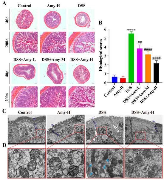 Effect of Amy administration on DSS-induced pathological damage to the colon of mice. (A,B) Representative micrographs of H&E staining and histological scoring of colon tissues (n = 6). Scale bar: 250 μm (top) and 50 μm (bottom). (C) Representative micrographs of intestinal epithelial cell ultrastructure by TEM. Scale bar: 2 μm. Mv: microvilli; TJ: tight junction; AJ: adherens junction; De: desmosomes. (D) Representative micrographs of mitochondria in the intestinal epithelial cell by TEM. Scale bar: 500 nm. Blue arrows show damaged and shrunken mitochondria. Compared to the control group, **** p < 0.0001. Compared to the DSS group, ## p < 0.01, and #### p < 0.0001.