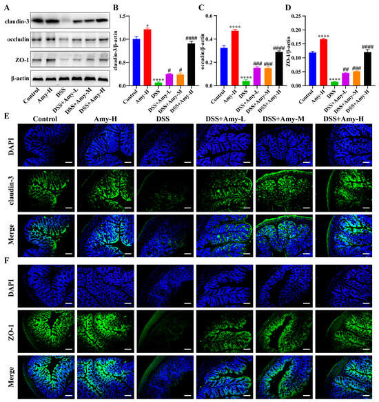 The disruption of the intestinal barrier is the basis for the development of IBD [30]. Members of the claudin, Zonula occludens (ZO), and occludins families are classical intercellular tight junction (TJ) proteins associated with intestinal integrity in colonic tissue [31]. In Figure 2C, we found that Amy administration improved the TJ between cells in mice with colitis. Thus, the expression of TJ-related proteins in the colon was then examined using Western blot and immunofluorescence. The Western blot results showed that DSS treatment reduced the levels of claudin-3, ZO-1, and occludin compared with treatment using the control group, while Amy administration significantly elevated the levels of claudin-3, ZO-1, and occludin in DSS-treated mice (Figure 3A–D). Moreover, the results of immunofluorescence staining further corroborated the above findings (Figure 3E,F). Collectively, these data demonstrate that Amy administration prevents DSS-induced disruption of the intestinal barrier in mice.