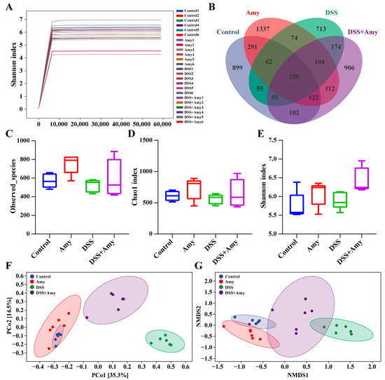 Effect of Amy administration on the diversity and structure of the intestinal flora in mice with DSS-induced colitis (n = 6). (A) Dilution curve. (B) Wayne diagram. (C) Observed_species index analysis. (D) Chao1 index analysis. (E) Shannon index analysis. (F) Principal coordinate analysis (PCoA). (G) Non-metric multidimensional scale (NMDS) analysis. OTUs: operational taxonomic units.