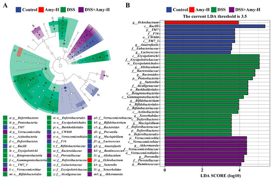 Effect of Amy administration on the composition of the gut microbiota in mice with DSS-induced colitis (n = 6). (A) Taxonomic cladogram (phylum, class, order, family and genus) from LEfSe showing taxonomic associations between groups of microbial communities. Each node represents a specific taxonomic type. Blue, red, green, and purple nodes indicate taxonomic types that are more abundant in the Control, Amy-H, DSS, and DSS + Amy-H groups than in the other groups, respectively. (B) LDA for the LEfSe analysis (LDA > 3.5, p < 0.05).