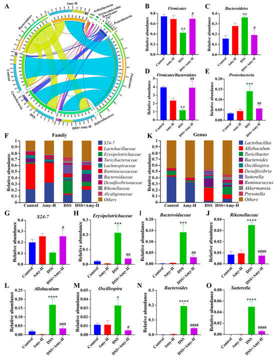 Effect of Amy administration on the relative abundance of specific intestinal bacteria in DSS-treated mice. (A) Circos of the intestinal flora distribution at the phylum level (n = 6). (B–E) Differences in the relative abundance of intestinal bacteria at the phylum level (n = 6). (F) The top 10 intestinal bacteria in relative abundance at the family level (n = 6). (G–J) Differences in the relative abundance of specific intestinal bacteria at the family level (n = 6). (K) The top 10 intestinal bacteria in relative abundance at the genus level (n = 6). (L–O) Differences in the relative abundance of specific intestinal bacteria at the genus level (n = 6). All data are expressed as mean ± SEM. Compared to the control group, * p < 0.05, ** p < 0.01, *** p < 0.001, and **** p < 0.0001. Compared to the DSS group, # p < 0.05, ## p < 0.01, ### p < 0.001, and #### p < 0.0001.