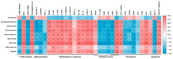 Spearman correlation analysis between intestinal flora and colitis-related indices. (* p < 0.05, ** p < 0.01, and *** p < 0.001).