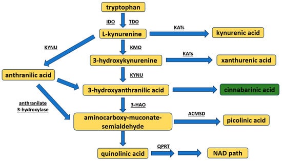 An overview of the synthesis of kynurenine pathway metabolites. The major metabolites are highlighted in yellow (note: cinnabarinic acid is accentuated in green). The following enzymes are spotlighted: 3-HAO—3-hydroxyanthranilate oxidase; ACMSD—aminocarboxy-muconate-semialdehyde decarboxylase; IDO—indoleamine-2,3-dioxygensase; KATs—kynurenine aminotransferases; KMO—kynurenine-3-monooxygenase; KYNU—kynureninase; NAD—nicotinamide adenine dinucleotide; TDO—tryptophan-2,3-dioxygenase; QPRT—quinolinate phosphoribosyltransferase.