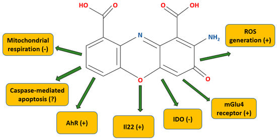 Chemical structure and overview of molecular targets and mechanisms of action of cinnabarinic acid. (+) means increases/stimulates, (−) means inhibits, (?) means contradictory data that need further investigation. For details, see text and Table 1. AhR—aryl hydrocarbon; IDO—indoleamine-2,3-dioxygenase; IL22—interleukine 22; mGlu4—metabotropic glutamate receptor type 4; ROS—reactive oxygen species.