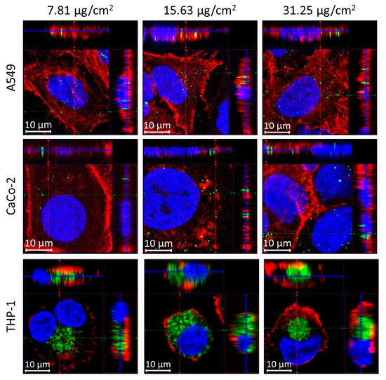 Cells were incubated with different concentrations of polystyrene beads with a 200 nm diameter and analyzed after 24 h and after 72 h of incubation (Supplementary Figure S2). Figure 1 shows representative fluorescence images of individual cells of the three different cell lines (A459, CaCo-2, and THP-1 cells) after incubation for 24 h at different concentrations. The green fluorescent polystyrene nanoparticles can be detected in all images inside the cells, as is clearly visible from the 3D ortho-projections at the selected xz- and yz-planes (Figure 1). Larger fields of view (FOV) of detailed images of the different cells with incorporated nanoparticles are presented in Supplementary Figure S3.