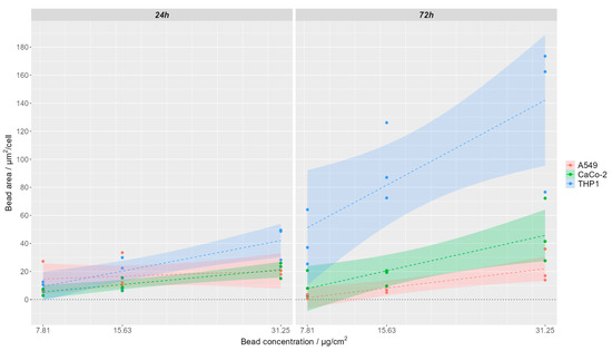 Polystyrene nanoparticle uptake was semi-quantitatively analyzed by determining the area of polystyrene bead-associated fluorescence and normalizing it to the number of cells found in the respective field of view. Example images of the analyzed FOV are shown for one representative replication in Supplementary Figure S4 for 24 h of incubation with nanoparticles and in Supplementary Figure S5 for 72 h of incubation with nanoparticles. The segmented cell area is indicated by yellow lines. Within each of the three replicates, the area of the analyzed field of view was 722,121 µm2 (THP-1) or 499,514 µm2 (A549, CaCo-2). The respective mean values for the different applied nanoparticle concentrations (7.81, 15.63 and 31.25 µg/cm2 culture area) for the different incubation times are depicted per cell line in Supplementary Figure S6, and a linear regression of the concentration-dependent increase of ingested bead area per cell is visualized in Figure 2.