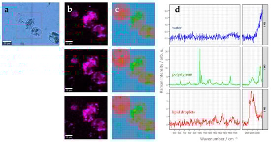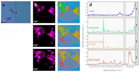 While fluorescence microscopy allows for relatively easy detection, localization, and quantification of microplastics inside the eukaryotic cells, it requires the microplastic particles to be fluorescent. For defined in vitro studies, this poses no difficulty as fluorescently labeled microplastics are available. However, if the uptake of environmental samples is to be considered, a method that can detect intracellular microplastic in a label-free manner is needed. Here, vibrational spectroscopy holds high potential. If sub-cellular spatial resolution is also of need, Raman micro-spectroscopy is a powerful method and was applied in this study. In agreement with the results of the fluorescently labeled polystyrene microplastics, it could be confirmed that THP-1 cells take up significant amounts of (also non-labeled) polystyrene particles. The particles are found in the cytoplasm, where they accumulate. Z-stack images allowed for the visualization of the microplastic particles in three dimensions within the eukaryotic cell in organelles around the cellular nucleus. This agrees with earlier uptake studies with polystyrene particles in A549 lung cells [35,36]. Raman-based analysis also holds the potential to follow the intracellular particle trafficking [37]. The drawbacks of Raman spectroscopic imaging are longer measurement times, making quantitative analysis more time consuming. Therefore, in the current contribution, only qualitative evidence for the nanoparticle uptake is provided. On the other hand, this method offers particular advantages for the analysis of unknown microplastics, as measured spectra can be compared with already known reference microplastic Raman spectra to determine the type of plastic and to be able to prove uptake by cells [38].