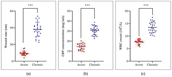Assessment of wound size (a), C-reactive protein (b), and white blood cell count (c) among the study groups. Data are represented as mean ± S.D. *** p < 0.001.