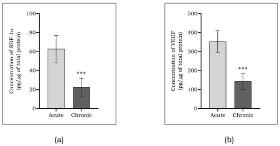 Angiogenesis play a vital role in wound healing, and the markers VEGF and SDF-1α are known to promote angiogenesis. The concentrations of angiogenic markers were quantified by multiplexing. As seen in Figure 2a, the concentration of SDF-1α in acute DFU patients was 62.8 ± 14.1, which seemed to be significantly reduced (p < 0.001) to about 22.4 ± 9.5 in patients with chronic DFU. Similarly, the concentration of VEGF (Figure 2b) in acute DFU patients was 352.9 ± 57.1, which seemed to be significantly reduced (p < 0.001) to about 161.9 ± 41.6 in patients with chronic DFU.