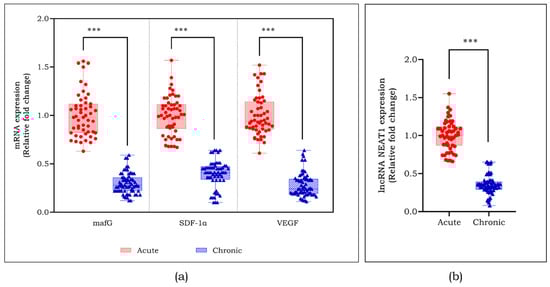 This study aimed to understand the regulatory mechanism of angiogenesis through non-coding RNAs. We initially measured the mRNA levels of angiogenic factors mafG, SDF-1α and VEGF, as well as the expression of lncRNA NEAT1 in the participants of the study. Figure 3a displays a notable reduction of angiogenic markers including mafG (p < 0.001), SDF-1α (p < 0.001), and VEGF (p < 0.001) in individuals with chronic DFU. The expression of lncRNA NEAT1 was decreased by approximately 2.5-fold (p < 0.001) in chronic DFU cases compared to acute DFU cases (Figure 3b).