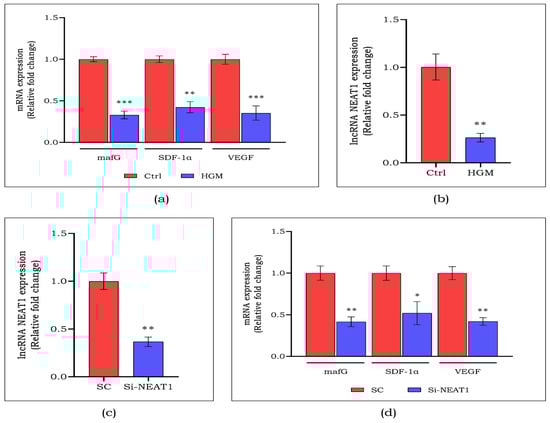 Expression of angiogenic targets (a) such as mafG, SDF-1α, VEGF, and lncRNA NEAT1 (b) in HGM-induced endothelial cells. Expression of lncRNA NEAT1 (c) and angiogenic targets (d) on siRNA-mediated silencing of lncRNA NEAT1. Data are represented as mean ± S.D.* p < 0.05, ** p < 0.01, *** p < 0.001.