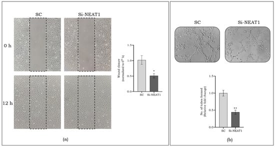 To clarify the specific function of lncRNA NEAT1 in regulating angiogenesis, we suppressed its expression using an antisense oligonucleotide (Si-NEAT1) and compared it with a scramble control (SC). Figure 4c shows a notable 3-fold drop in lncRNA NEAT1 expression (p < 0.01) in Si-NEAT1. The association of lncRNA NEAT1 in angiogenesis was confirmed by significantly reduced expressions of markers such as mafG (2.5-fold, p < 0.01), SDF-1α (2-fold, p < 0.05), and VEGF (2.5-fold, p < 0.01) in Si-NEAT1 (Figure 4d). Further, endothelial cell migration is one of the essential parameters for the regulation of angiogenesis. From Figure 5a, we observed almost 2-fold decreased cell migration (p < 0.05) on inhibition of lncRNA NEAT1 compared to SC. Moreover, the angiogenic ability of NEAT1-silenced endothelial cells was assessed using an in vitro tube-formation assay. As seen in Figure 5b, we observed a significant decrease in the tube-formation ability of NEAT1-silenced endothelial cells, compared to SC.
