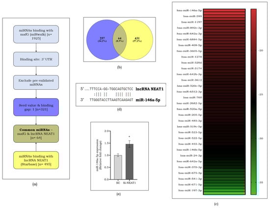 lncRNAs act as miRNA sponges to control the action of miRNA, reducing their effect on target mRNAs. Hence, to select the putative target of lncRNA NEAT1, we adapted an in silico screening. Figure 6a represents the overall workflow followed to determine the potential miRNA. The common miRNAs that are regulated by lncRNA NEAT1 and that regulate mafG were screened (Figure 6b). The binding score of targets was evaluated for all selected miRNAs and that of miR-146a-5p was observed to be the highest (Figure 6c). Figure 6d represents the targeted binding site of miR-146a-5p and lncRNA NEAT1. To determine miR-146a-5p as a putative target of lncRNA NEAT1, the expression of target miRNA was assessed in Si-NEAT1 and was found to be increased (1.5-fold, p < 0.05), compared to SC (Figure 6e).