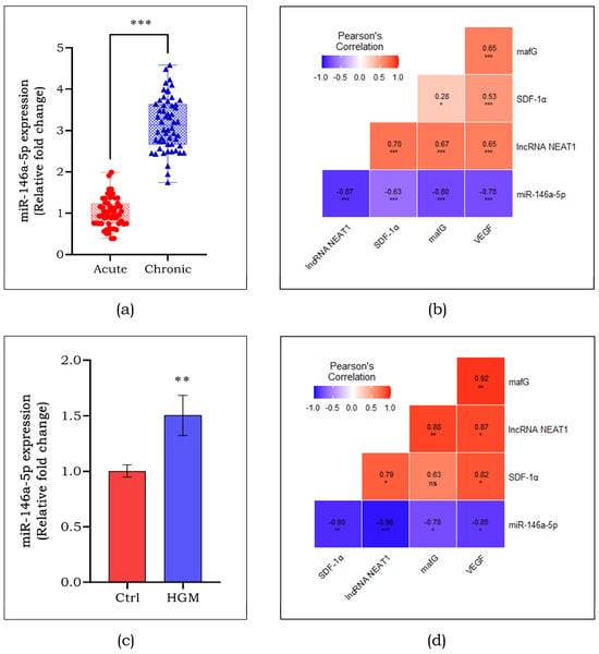 Based on the observations in Section 3.5, the expression of miR-146a-5p was assessed in DFU subjects. An almost 3-fold (p < 0.001) increased expression of miR-146a-5p was seen in chronic DFU compared to that of acute DFU (Figure 7a). To determine the association of target lncRNA and miRNA with the study markers, Pearson’s correlation analysis was performed. Figure 7b shows a significant negative connection between miR-146a-5p and lncRNA NEAT1, as well as other angiogenic targets. Further, we also evaluated the clinical evidence in vitro using endothelial cells exposed to a hyperglycemic microenvironment (Figure 7c), and found upregulated miR-146a-5p expression (1.5-fold; p < 0.01), which negatively correlated with lncRNA NEAT1, and angiogenic markers other than SDF-1α (Figure 7d). From the correlation analysis, it was also observed that lncRNA NEAT1 has a strong positive correlation with mafG in both chronic DFU subjects (p < 0.001) and HGM-induced endothelial cells (p < 0.01).