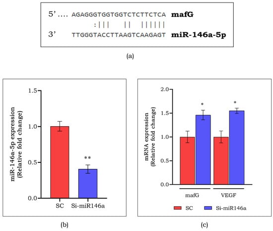 Targeted binding site of miR-146a-5p and mafG (a). Expression of miR-146a-5p (b) and angiogenic targets mafG and VEGF (c) upon silencing miR-146a-5p in endothelial cells. Data are represented as mean ± S.D. * p < 0.05, ** p < 0.01.