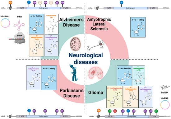 Among all epigenetic modifications, RNA modifications are generally considered distinct from classical modifications involving DNA and histones [1]. Recently, more studies have been reported on “epitranscriptomics”, which refers to a molecular biology field that focuses on the biochemical modifications of RNA molecules and their effect on gene expression and various cellular functions [2]. Epitranscriptomics research aims to understand the distribution patterns, biogenesis mechanisms, and regulatory functions of modified RNA molecules, as well as the interactome, evolutional conservation, and novel reader proteins. It has become evident that the information carried by RNA molecules is not static and can be dynamically modified by adding, removing, or modifying chemical groups [3]. The link between atypical RNA modifications and a range of neurological disorders highlights the significance of these chemical modifications in understanding the underlying mechanisms of these diseases. Regulating RNA modifications can provide new opportunities for therapies, as they offer a new area of biology to explore. In this review, we will outline the RNA modifications, including non-coding RNAs, and uncover their distinct functions and the consequential effects on cellular and physiological processes in the pathogenesis of neurologic disorders (Figure 1).