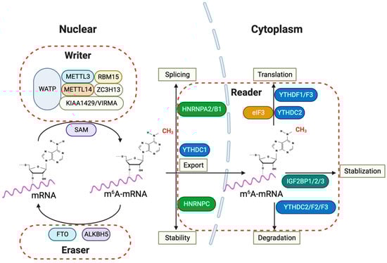 Since the 1970s when m6A modification was first identified [4], m6A became the most extensively researched and prevalent RNA modification in human cells [5]. With the advancement of identifying and detecting transcriptome-wide m6A distribution at single-base resolution [6,7], we now know that m6A modifications are crucial in various biological processes, including gene expression regulation, RNA processing, and RNA stability. These modifications are installed by methyltransferase complexes and can be reversed by demethylases, allowing them to have a dynamic and reversible nature. m6A marks have been discovered across different RNA repertoires: mRNAs, rRNAs, transfer RNAs (tRNAs), circular RNAs (circRNAs), and micro RNAs (miRNAs). Specifically for mRNAs, most m6A marks are situated at the start of the final exons, in the 3′-untranslated region (UTR), or near to the stop codons [8,9]. For long non-coding RNAs (lncRNAs), high-throughput methods revealed that human m6A marks were mapped to certain well-characterized lncRNAs, including X-inactive specific transcript (XIST) and metastasis-associated lung adenocarcinoma transcript 1 (MALAT-1) [10,11,12]. Writer complexes like Methyltransferase-like 3 and 14 (METTL3 and METTL14), Wilms tumor 1-associated protein (WTAP), Zinc finger CCCH domain-containing protein 13 (ZC3H13), RNA-binding motif protein 15/15B (RBM15/15B), and Vir-like m6A methyltransferase-associated protein (VIRMA) mediate the methylation of adenosine residues at position 6 [13,14,15,16,17]. METTL3 and METTL14 are heterodimers that form the core complex responsible for methyltransferase activity, stabilized by the association of another complex formed by WTAP, RBM15, ZC3H13, and VIRMA called the methylation-associated complex. METTL16 which is also one of the components of the m6A writer complexes, along with WTAP, is known to engage with specific lncRNAs, such as MALAT-1 [10]. YTHDF1, YTHDF2, YTHDF3, YTHDC1, YTHDC2, IGF2BP1, IGF2BP2, and IGF2BP3 have been identified as reader proteins that detect the m6A methylation marks. For instance, YTHDC1 facilitates the nuclear export of methylated mRNAs to the cytoplasm by specifically binding with m6A. Suppressing YTHDC1 leads to the nuclear buildup of m6A-modified mRNA, causing these transcripts to accumulate within the nucleus and become scarce in the cytoplasm [18]. In addition, it has been reported that m6A modifications in circRNAs promote efficient protein translation in a cap-independent fashion through YTHDF3 and the translation initiation factors eIF4G2 and eIF3A [19]. This m6A-driven translation by circRNAs can be enhanced by METTL3 and METTL14. Meanwhile, enzymes such as FTO and ALKBH5 act as erasers for removing m6A marks. m6A modifications can either increase or decrease mRNA stability, depending on the specific reader proteins that bind them. Functionally, m6A participates in nearly every stage of the mRNA life cycle, affecting splicing, other nuclear processing, and degradation within the cytoplasm [20].