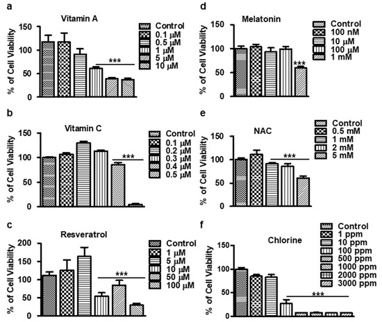 The following materials were used for this study: vitamin A (#11017, Cayman, CO, USA), vitamin C (#A4403, Sigma-Aldrich, St. Louis, MO, USA), melatonin (#M 5250, Sigma-Aldrich, St. Louis, MO, USA), N-Acetyl Cysteine (NAC; #A9165, Sigma-Aldrich, St. Louis, MO, USA), chlorine (#198016, Thermo Fisher Scientific, Waltham, MA, USA), and resveratrol (#554325, Sigma-Aldrich, St. Louis, MO, USA).