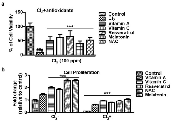 Cell proliferation of antioxidants in Cl2-treated HCECs. (a,b) The HCECs are exposed to 100 ppm Cl2 for 30 min and are followed by treatment with antioxidants for 24 h. The results indicate the percentage of cell proliferation vs. the control cells (untreated). Values are the mean ± SEM (n = 6). The data were analyzed by one-way ANOVA analysis with Tukey’s post hoc analysis. A significant difference, ### p < 0.001 was observed in the percentage of cell viability vs. untreated cells and Cl2-treated cells. A significant difference, *** p < 0.001 was observed in the percentage of cell viability vs. antioxidant-treated cells. Vitamin A: 100 μM, vitamin C: 300 μM, resveratrol: 5 μM, melatonin: 100 μM, NAC: 500 μM.