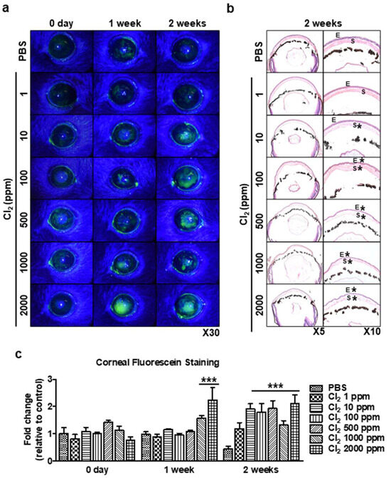 In vivo evaluation of chlorine’s impact on mice eyes using corneal fluorescein staining. Mice corneas were applied to various doses of Cl2 (1, 10, 100, 500, 1000, and 2000 ppm; 10 µL, 30 s) once a day for 2 weeks. (a) Representative images of murine corneas showing fluorescein staining with Cl2 treatment. (b) H&E staining of various doses of Cl2-treated murine corneas. E: epithelium, S: stroma. *: damaged area. (c) Graph showing the intensity fold change of corneal fluorescein staining after application of Cl2 treatment (n = 4/group) for 2 weeks. Values are the mean ± SEM (n = 4). The results indicate that corneal fluorescein staining was greatly increased in a dose-dependent manner compared to the control group (PBS-treated). A significant difference, *** p < 0.001 was observed in the fold change of fluorescein staining vs. the control groups (PBS-treated on 1 week or 2 weeks).